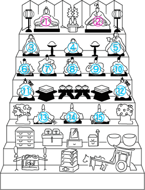| ■雛人形の飾り方 雛人形を飾るには、まず据える場所をきちんと決めてからひな壇を作りましょう。人形を扱う時には、できれば手袋を用意して下さい。素手で触ると手の油が付き、そこからカビが生えることがあります。 人形は中心を決めて左右バランスよく置きましょう。飾ってから、少し離れて眺め、バランスを見ると良いでしょう。 お人形が痛まないように飾るのも大切です。特に直射日光が当たる場所は厳禁です。乾燥し過ぎは人形にとって良くありませんし、紫外線によって衣裳が変色・退色することもあります。暖房の温風が直接当たるような場所も大敵です。 |